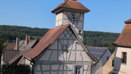 Wir laufen durch das Städtle Ingelfingen, vorbei am Schloss(heute Rathaus), die Weinberge, am Ingelfinger-Fass vorbei, hoch zum Griesbacher...